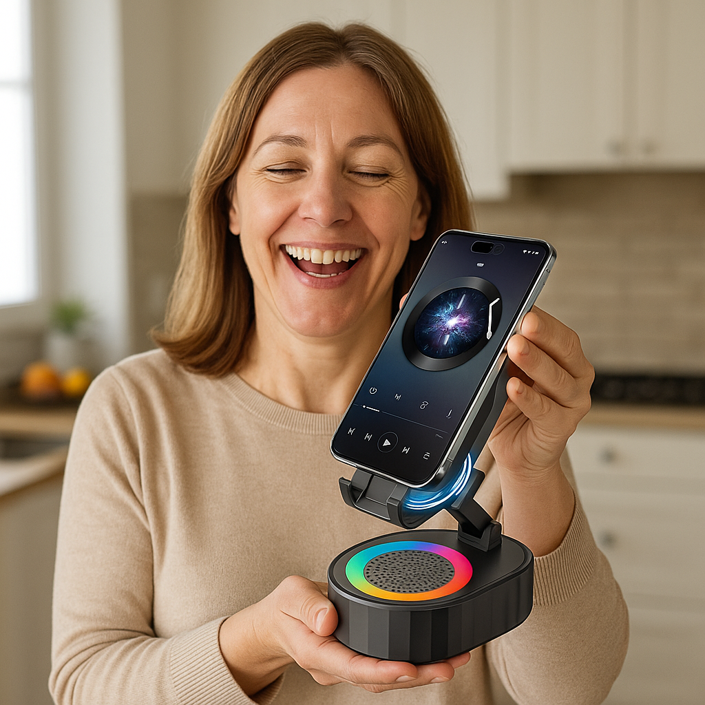 As a mom, I use this for everything—from playing lullabies in the nursery to watching recipe videos while cooking. It's so simple my kids use it too. No cables, no connections, just instant sound. And I love how it props up my phone while charging—makes multitasking way easier. Highly recommend for busy people!